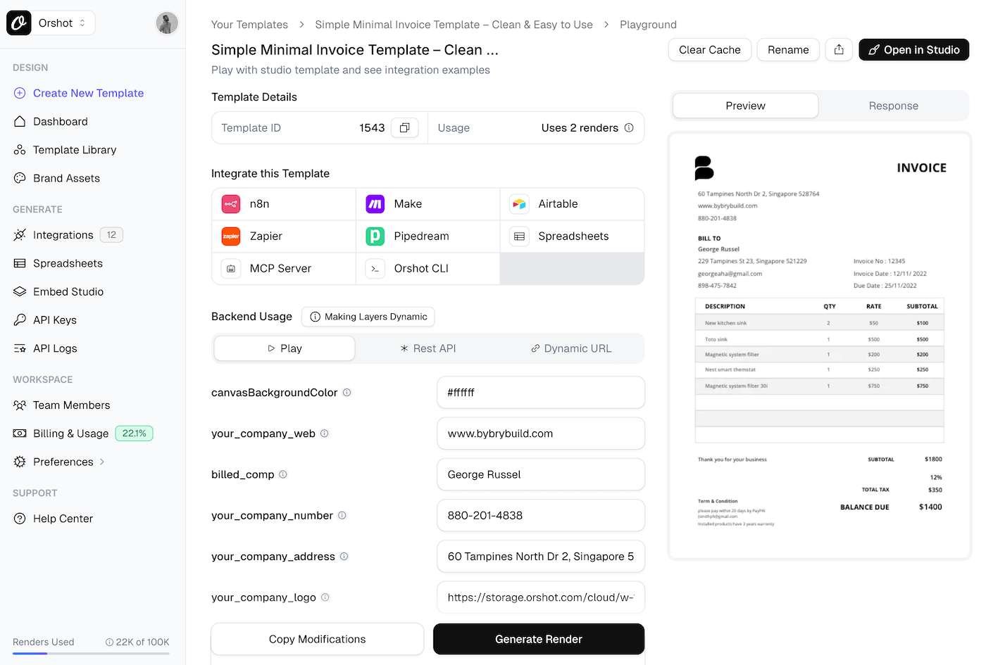 Automated invoice generation eliminates manual work and ensures consistency across all your invoices. With Orshot's invoice templates and REST API, you can set up automated invoice generation in minutes.