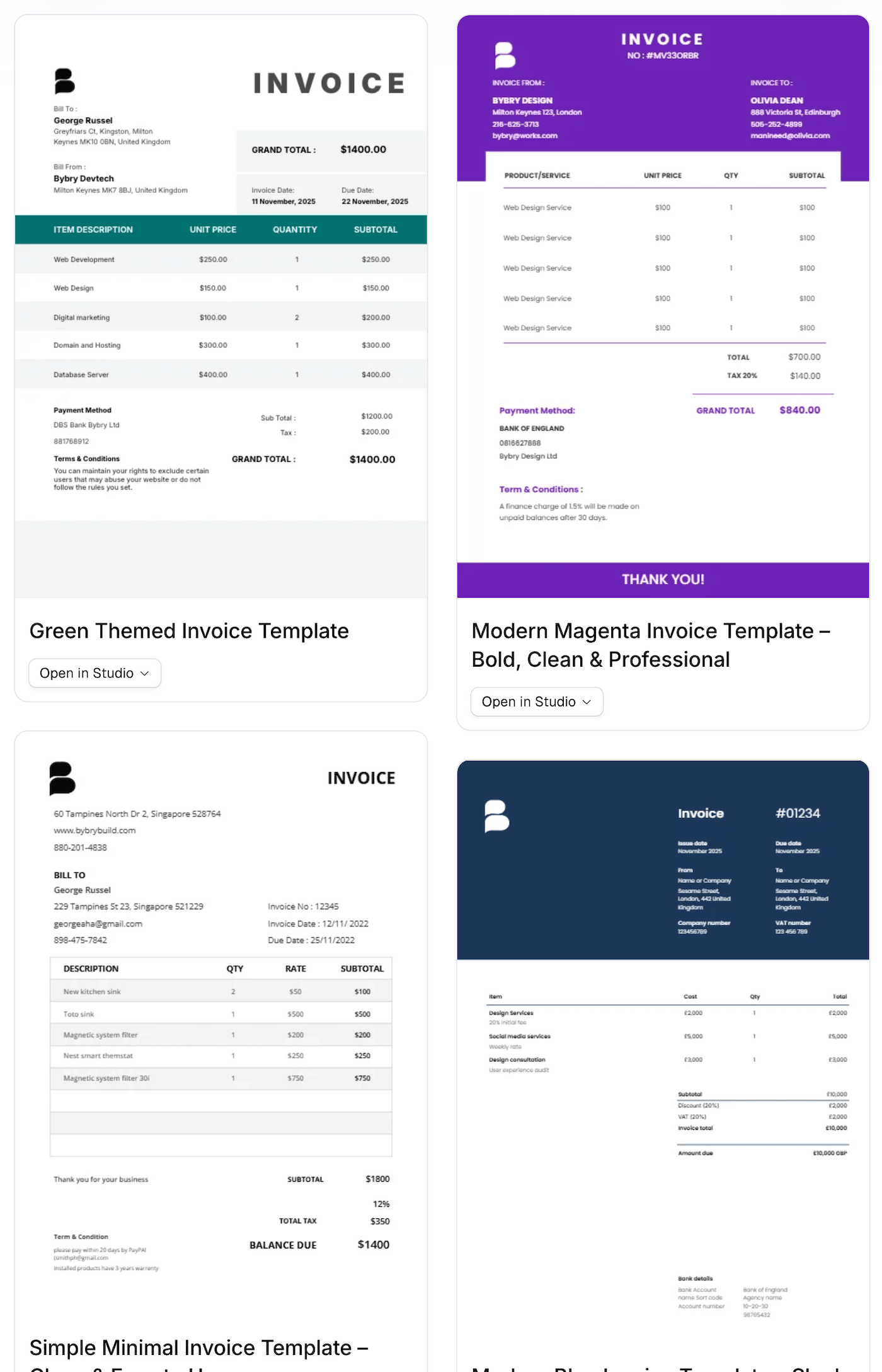 Browse the invoice template gallery and select a template that matches your branding. Click on "Open in Studio" to customize the selected template.