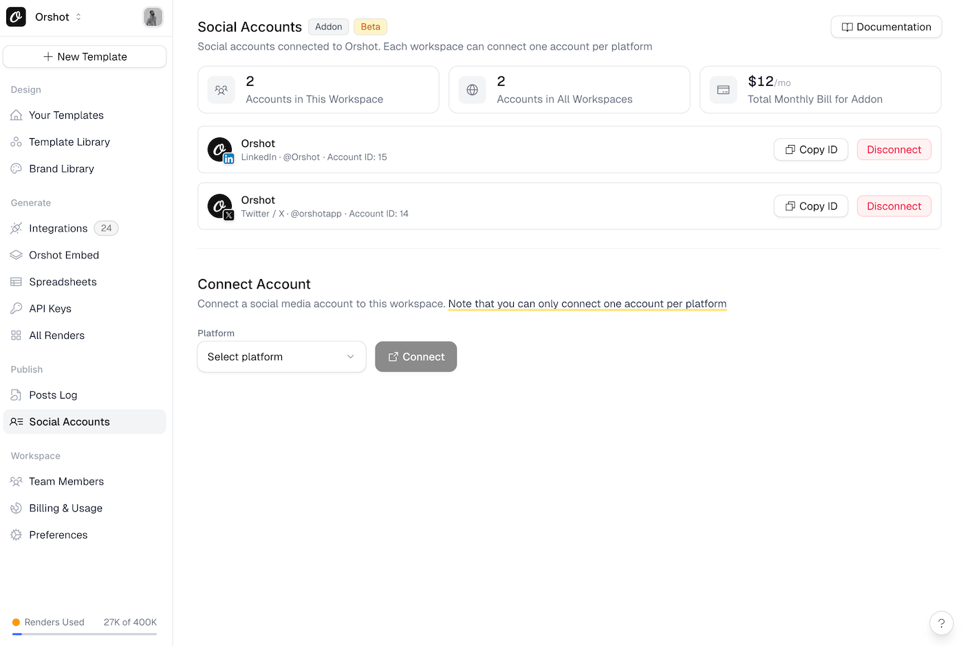 So we built Orshot Publish — a way to post directly to your social media accounts from your Orshot dashboard or via the API. Generate and publish in the same place. No more juggling between tools.