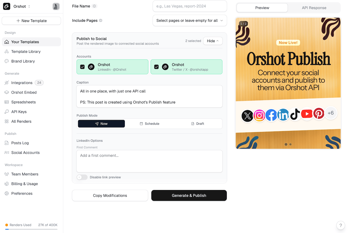 If you're already using Orshot's API to generate renders programmatically, you can now publish them too. The Orshot API now lets you send a publish object in your request, where you can configure which socials to post, the caption(we support per platform captions), and other settings. Orshot API will automatically process the render, and publish it on all the selected socials. You can also draft or schedule these posts on your socials