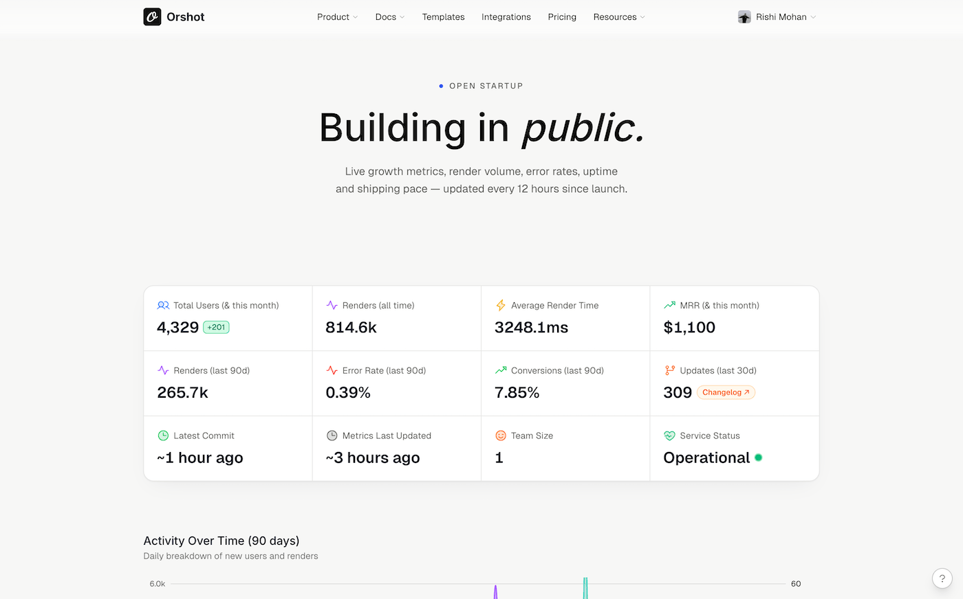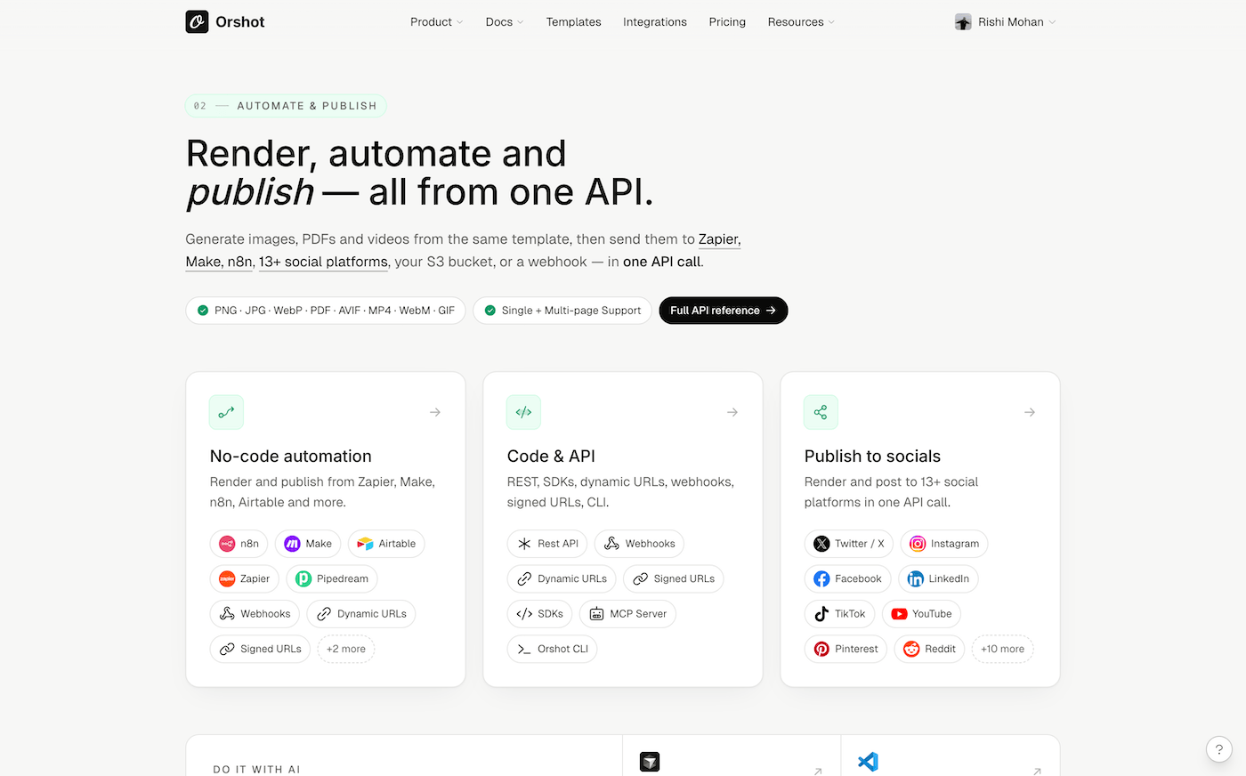 Your API, your templates, your keys, your integrations, your workflows. Nothing you built on Orshot changes. 2.0 is a surface rewrite — render endpoints, modifications, and output formats are identical. Upgrade is a page refresh.