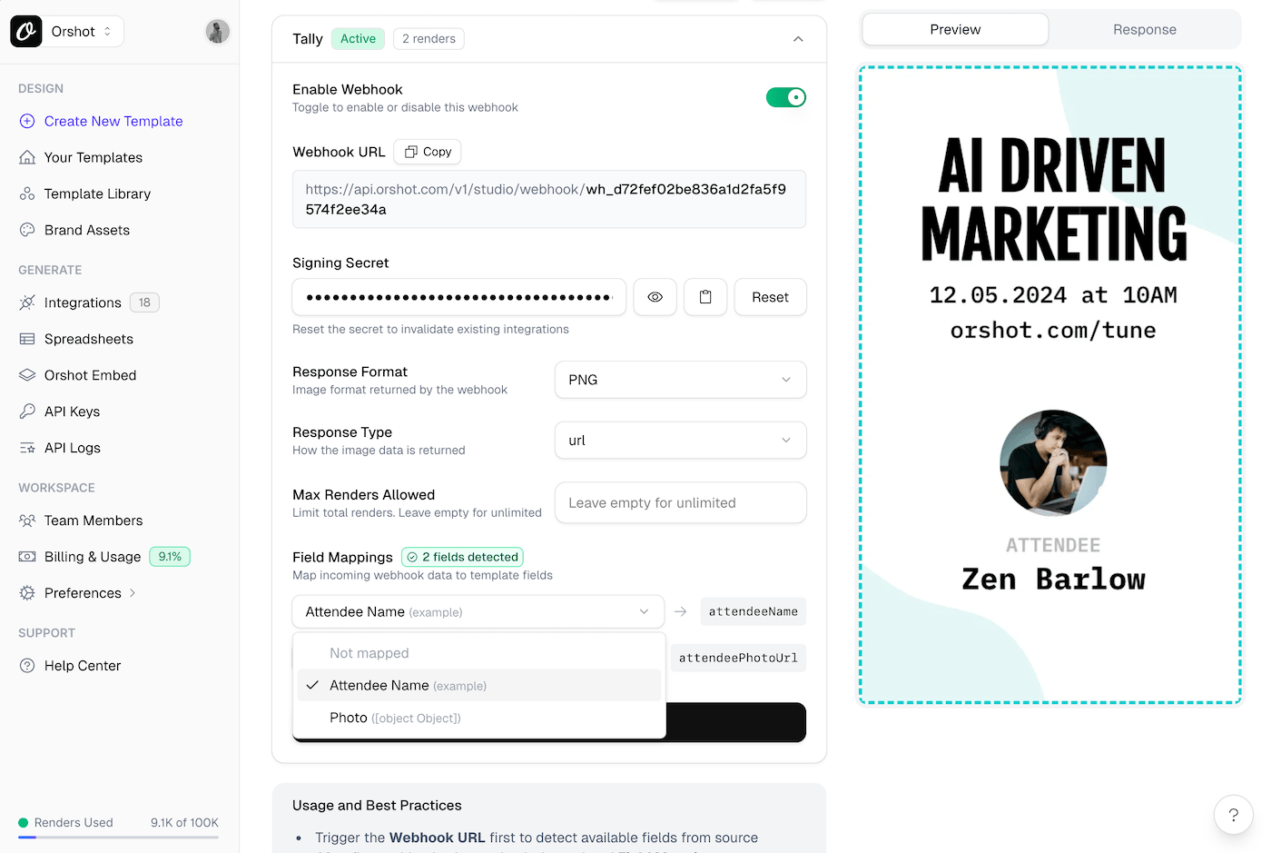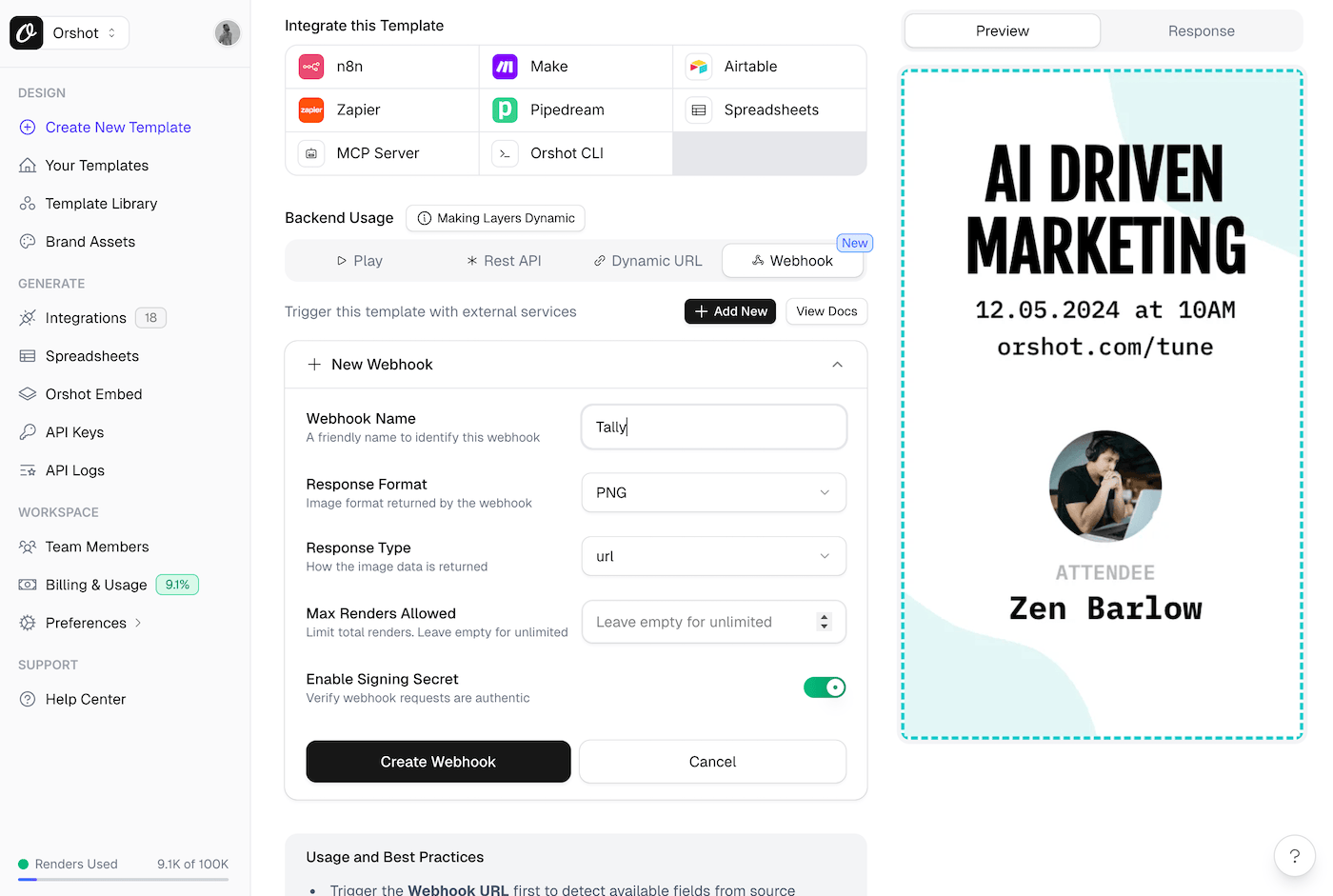 That's it—automatic image or PDF generation from Tally forms in about 10 minutes. No code, no complex automation tools. Just connect your form to Orshot and let webhooks handle the rest.
