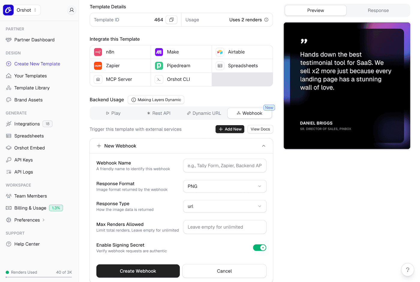 Webhooks allow you to automatically generate images and PDFs when events occur in external services like Typeform, Tally, Zapier, Make, n8n, or your own backend. Instead of making API calls with an API key, you use a unique webhook URL that handles authentication automatically.