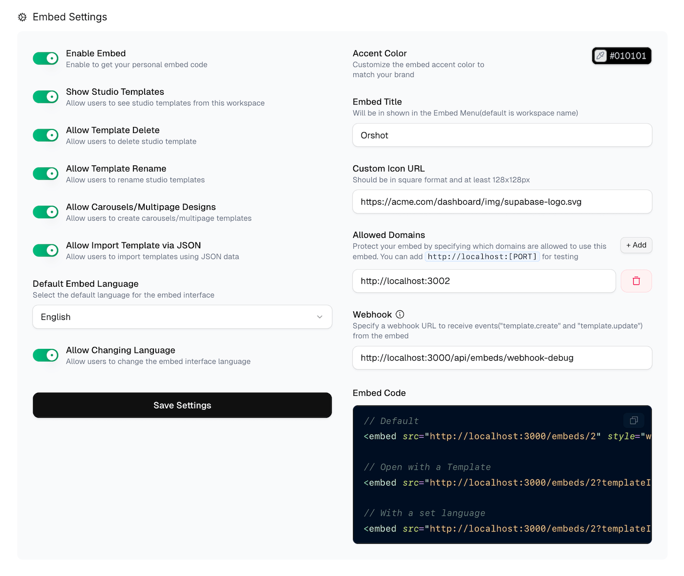 http://localhost:3000Only these domains will be able to load your embed. Leave empty to allow any domain (not recommended for production).