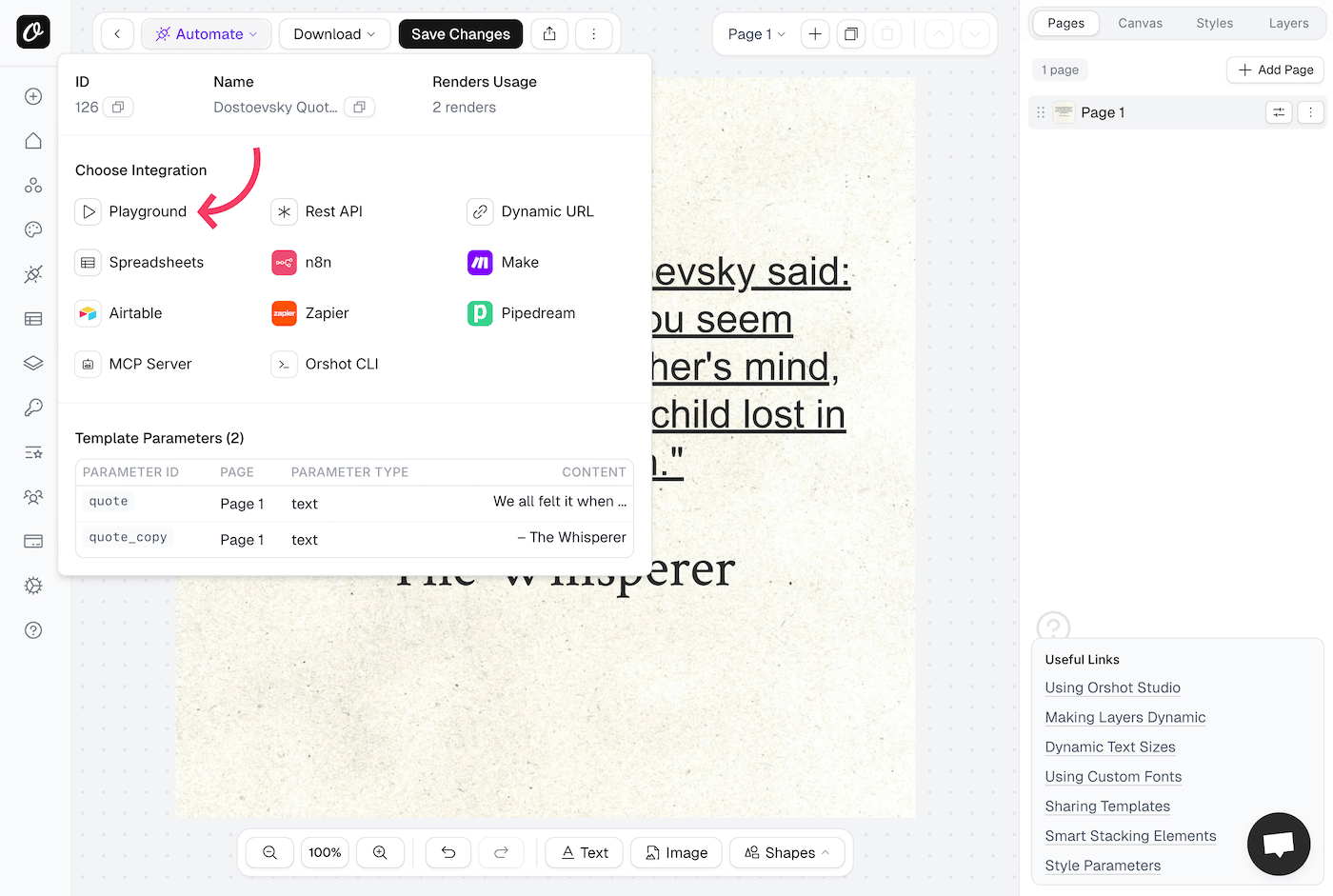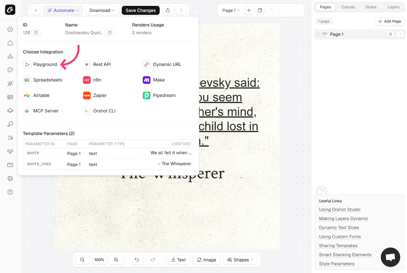 The quickest way to generate an image or PDF from a template is to first go to Template's Playground