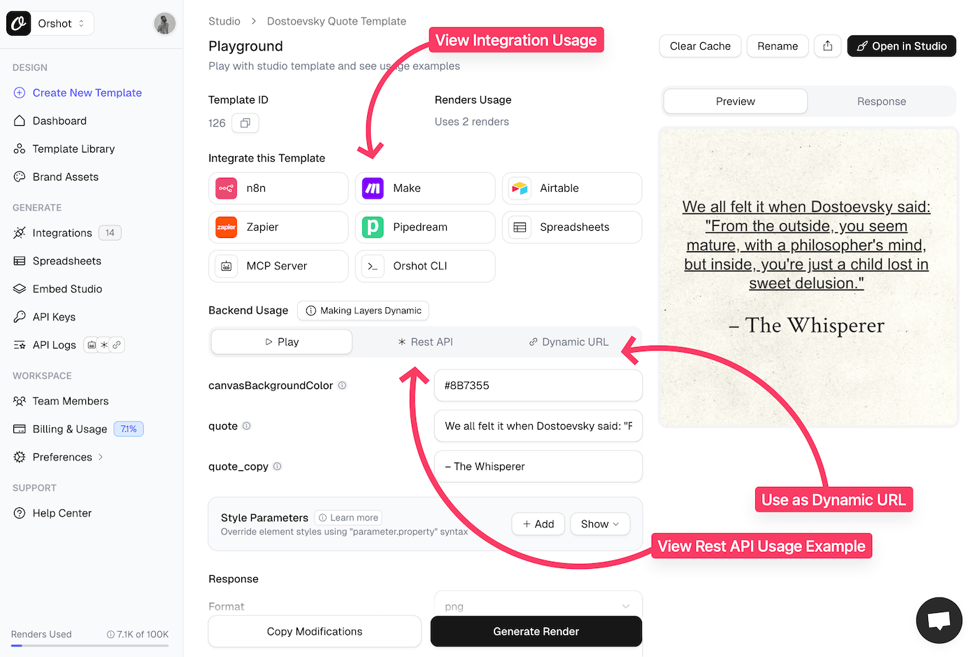 Now that you have a template and API key, you can start generating images. You have two options: use the REST API directly, or use a no-code integration.