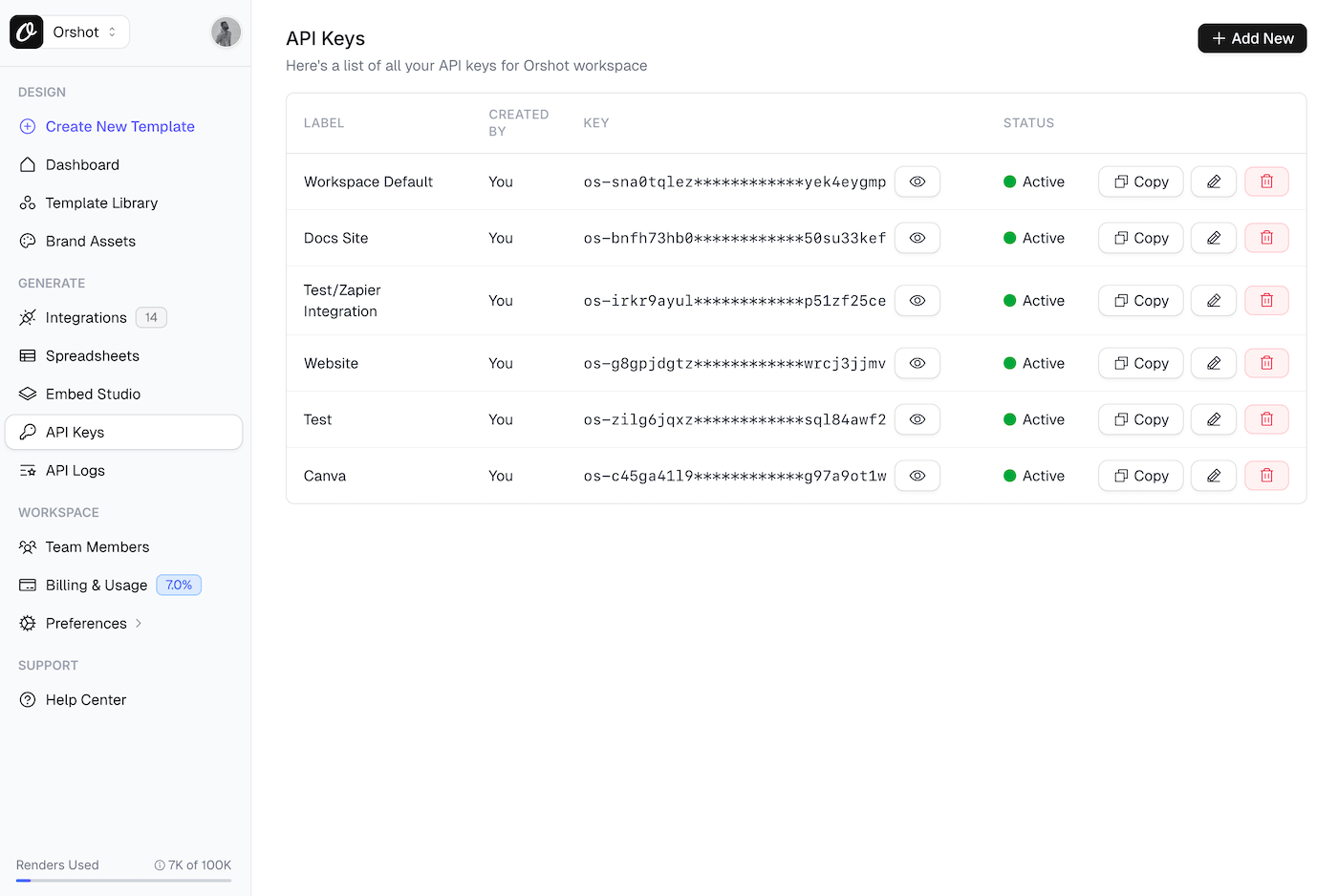 Once on the API Keys page, you'll see all your existing API keys listed. Each key shows: