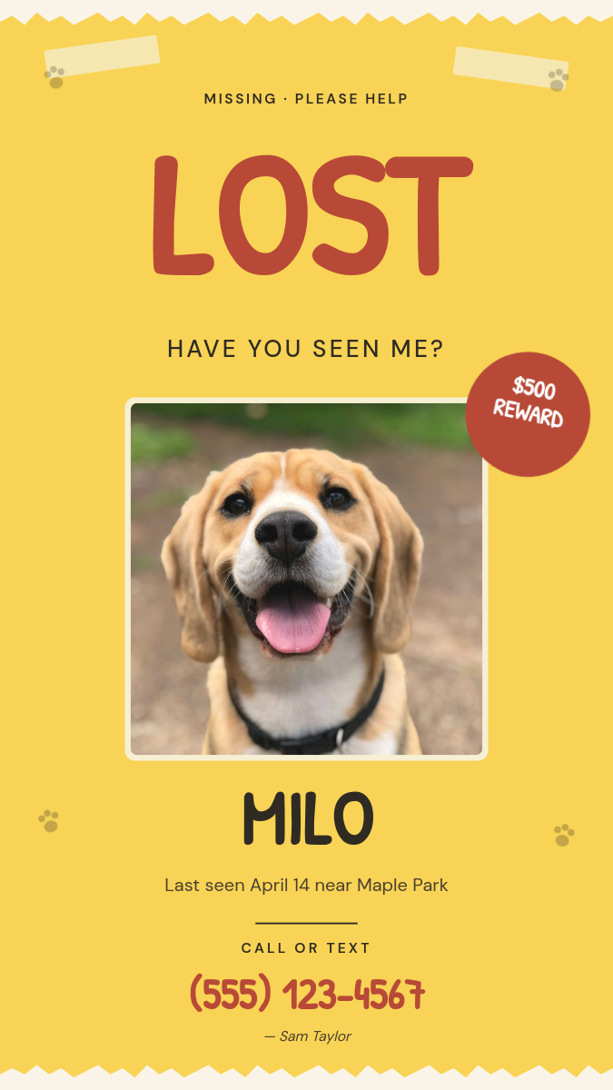 You can generate Have You Seen Milo — Lost Pet Flyer Instagram Story renders using Rest API