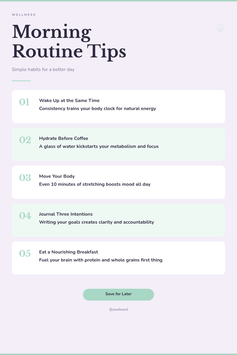 You can generate Morning Routine Tips — Wellness Listicle Pinterest Pin renders using Rest API